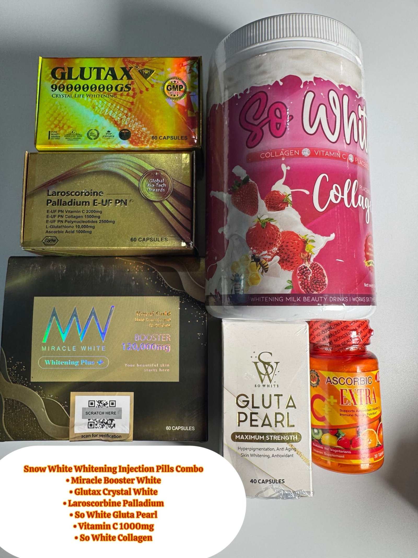 Home SUPPLEMENTS Miracle White, Laroscorbine, Glutax Crystal, Gluta Pearl, So White, Vitamin C Injection Pills Combo Super White 3X