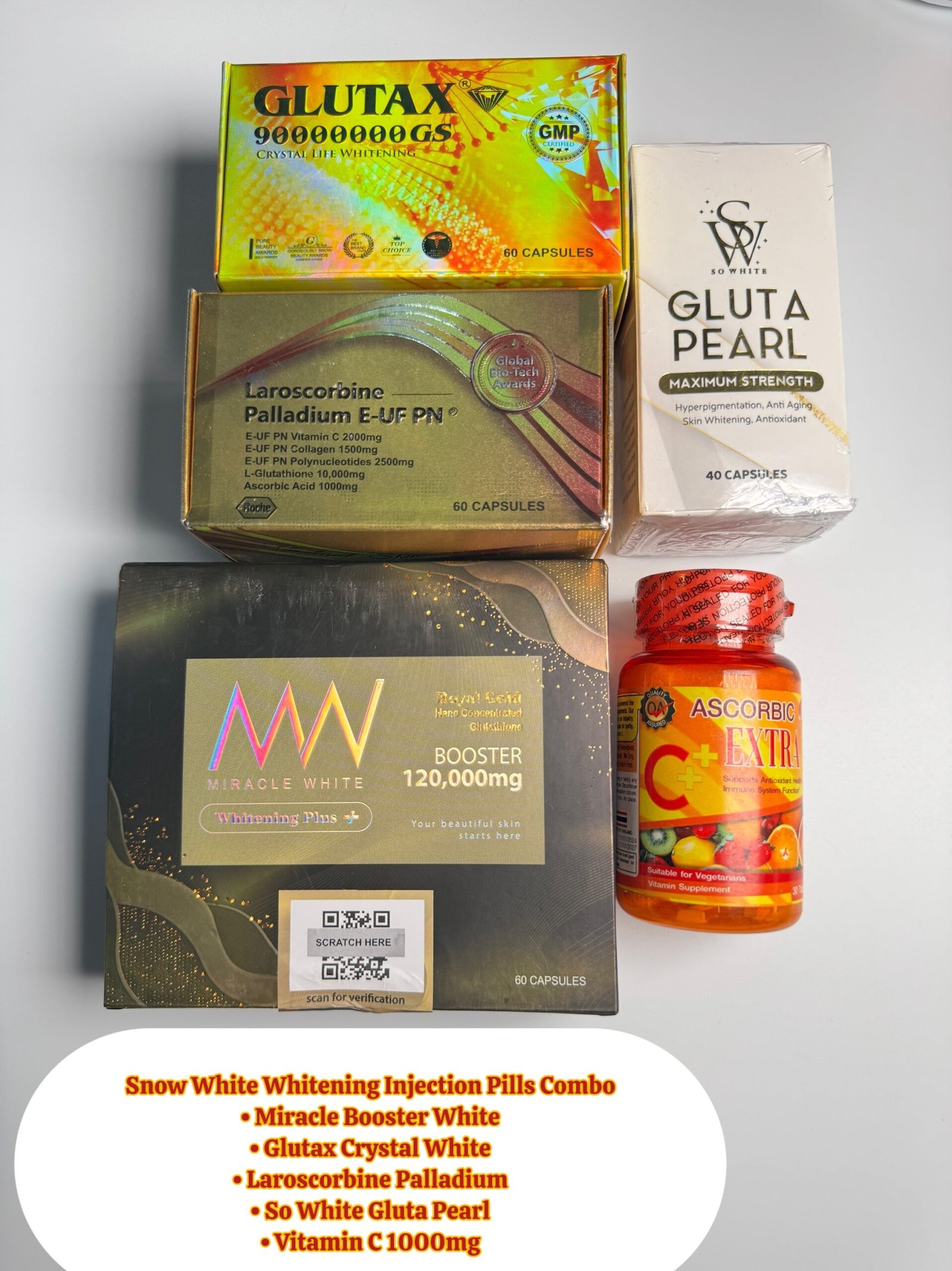 Miracle White, Laroscorbine, Glutax Crystal, Gluta Pearl, Vitamin C Injection Pills Combo Super White 2X